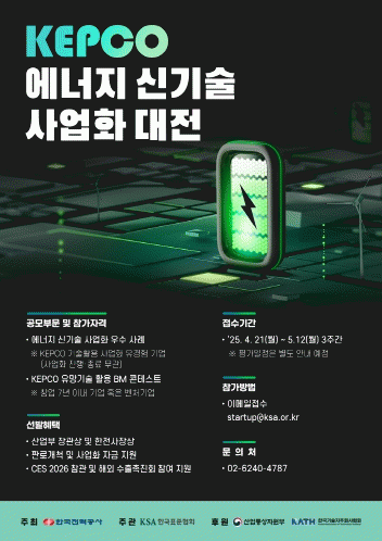 [NWS¹æ¼Û=ÇãÀº¼­ ±âÀÚ] Çѱ¹Àü·ÂÀº ¿¡³ÊÁö ½Å±â¼ú »ç¾÷È­¸¦ Ȱ¼ºÈ­Çϱâ À§ÇØ 'KEPCO ¿¡³ÊÁö ½Å±â¼ú »ç¾÷È­ ´ëÀü'À» óÀ½À¸·Î °³ÃÖÇÑ´Ù. À̹ø Çà»ç´Â 4¿ù 21ÀϺÎÅÍ 5¿ù 12ÀϱîÁö °ø¸ð¸¦ ÁøÇàÇϸç, ÇÑÀüÀÌ ÁÖÃÖÇϰí Çѱ¹Ç¥ÁØÇùȸ°¡ ÁÖ°üÇϸ硦
