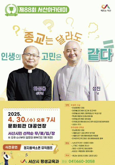 [NWS¹æ¼Û=Çѽ¸ñ ±âÀÚ]Ãæ³² ¼­»ê½Ã´Â ¼ºÁø ½º´Ô°ú Çϼº¿ë ½ÅºÎ¸¦ ÃÊÃ»ÇØ ¡®Á¾±³´Â ´Þ¶óµµ ÀλýÀÇ °í¹ÎÀº °°´Ù¡¯¸¦ ÁÖÁ¦·Î Á¦88ȸ ¼­»ê¾ÆÄ«µ¥¹Ì¸¦ °³ÃÖÇÑ´Ù°í 18ÀÏ ¹àÇû´Ù. Á¦88ȸ ¼­»ê¾ÆÄ«µ¥¹Ì´Â 4¿ù 30ÀÏ ¿ÀÈÄ 7½Ã ¼­»ê½Ã ¹®È­È¸°ü ´ë°ø¡¦