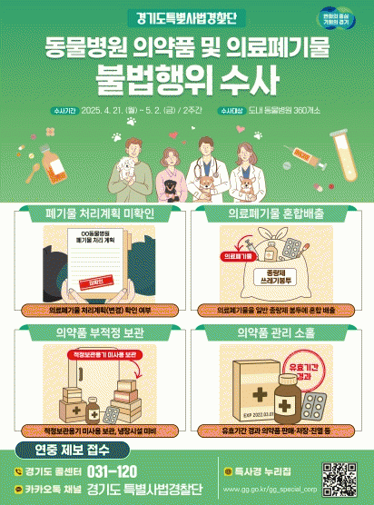 [NWS¹æ¼Û=Çѽ¸ñ ±âÀÚ]°æ±âµµ°¡ ¹Ý·Áµ¿¹° Áõ°¡¿¡ µû¸¥ µ¿¹°º´¿ø ÀÇ·áÆó±â¹° ºÒ¹ý ó¸®¿Í ÀǾàǰ °ü¸® ¼ÒȦ ¹®Á¦¸¦ ±ÙÀýÇϱâ À§ÇØ 4¿ù 21ÀϺÎÅÍ 5¿ù 2ÀϱîÁö 2ÁÖ°£ ±¤¿ª¼ö»ç¸¦ ½Ç½ÃÇÑ´Ù. À̹ø ¼ö»ç´Â ¹Ý·Áµ¿¹° ¾çÀ° Àα¸ ±ÞÁõÀ¸·Î µ¿¹°º´¡¦