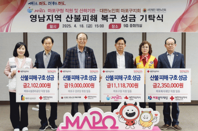 [NWS¹æ¼Û=Çѽ¸ñ ±âÀÚ]¸¶Æ÷±¸´Â 4¿ù 18ÀÏ ¿ÀÈÄ, ÃÖ±Ù ¹ß»ýÇÑ ´ëÇü »êºÒ·Î Å« ÇÇÇØ¸¦ ÀÔÀº ¿µ³²Áö¿ªÀÇ ÀÌÀç¹ÎÀ» µ½±â À§ÇØ ÃÑ 3,519¸¸ ¿øÀÇ ¼º±ÝÀ» ´ëÇÑÀû½ÊÀڻ翡 Àü´ÞÇÏ´Â ±âʽÄÀ» ¿­¾ú´Ù. ±âŹ½Ä¿¡´Â ¹Ú°­¼ö ¸¶Æ÷±¸Ã»Àå°ú ´ëÇѳëÀÎȸ¡¦