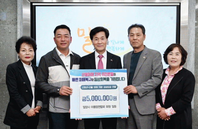 [NWS¹æ¼Û=Çѽ¸ñ ±âÀÚ]¹Ð¾ç½Ã´Â ¹Ð¾ç½Ã ÀÌÅëÀ忬ÇÕȸ(ȸÀå ¹ÚÁ¤±Ô)¿¡¼­ ½ÃÀå½ÇÀ» ¹æ¹®ÇØ Áö³­ 3¿ù ¹ß»ýÇÑ »êºÒ·Î Å« ÇÇÇØ¸¦ ÀÔÀº °æ³² Áö¿ª ÁֹεéÀ» µ½±â À§ÇÑ ¼º±Ý 500¸¸¿øÀ» Àü´ÞÇß´Ù°í 18ÀÏ ¹àÇû´Ù. ¼º±Ý Àü´Þ½Ä¿¡´Â ¹ÚÁ¤±Ô ȸÀåÀ» ¡¦