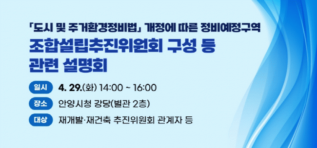 [NWS¹æ¼Û=Çѽ¸ñ ±âÀÚ]¿À´Â 6¿ù 4ÀϺÎÅÍ °³Á¤µÈ µµ½Ã ¹× ÁÖ°Åȯ°æÁ¤ºñ¹ýÀÌ ½ÃÇàµÊ¿¡ µû¶ó, ¾È¾ç½Ã´Â µµ½ÃÁ¤ºñ¹ýÀÇ Á¶ÇÕ¼³¸³ÃßÁøÀ§¿øÈ¸ ±¸¼º °ü·Ã ÁÖ¿ä °³Á¤»çÇ×À» ¾È³»ÇÏ´Â ¼³¸íȸ¸¦ °³ÃÖÇÑ´Ù°í 18ÀÏ ¹àÇû´Ù. ½Ã´Â ÀÌ´Þ 29ÀÏ ¿ÀÈÄ 2½Ã¿¡¡¦