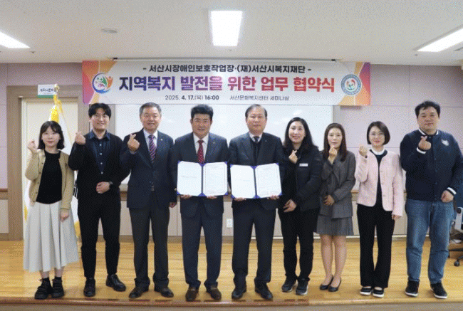 [NWS¹æ¼Û=Çѽ¸ñ ±âÀÚ]¼­»ê½Ãº¹ÁöÀç´Ü°ú ¼­»ê½ÃÀå¾ÖÀκ¸È£ÀÛ¾÷ÀåÀº 4¿ù 17ÀÏ ¼­»ê¹®È­º¹Áö¼¾ÅÍ ¼¼¹Ì³ª½Ç¿¡¼­ Áö¿ª º¹Áö ¹ßÀüÀ» À§ÇÑ ¾÷¹« Çù¾àÀ» ü°áÇß´Ù. Çù¾à½Ä¿¡´Â ¼­»ê½Ãº¹ÁöÀç´Ü Àå°©¼ø ÀÌ»çÀå°ú ¼­»ê½ÃÀå¾ÖÀκ¸È£ÀÛ¾÷Àå ±èÁØÈ¯¡¦
