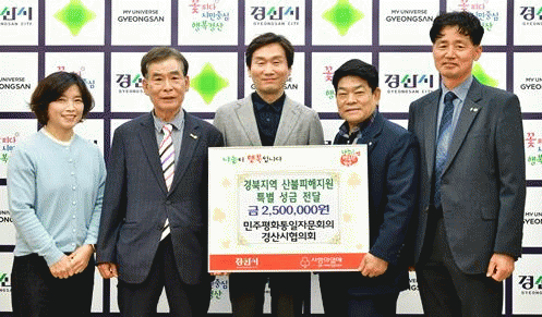 [NWS¹æ¼Û=Çѽ¸ñ ±âÀÚ]¹ÎÁÖÆòÈ­ÅëÀÏÀÚ¹®È¸ÀÇ °æ»ê½ÃÇùÀÇȸ¿¡¼­ 17ÀÏ °æ»ê½ÃûÀ» ¹æ¹®ÇÏ¿© »êºÒ ÇÇÇØ·Î »îÀÇ ÅÍÀüÀ» ÀÒÀº ÀÌ¿ôµéÀ» À§ÇØ ¸¶À½À» ´ã¾Æ ¼º±Ý 250¸¸¿øÀ» ±âŹ Çß´Ù. ±èÇü¼ö ÇùÀÇȸÀåÀº¡°´º½º¸¦ ÅëÇØ »êºÒ ÇÇÇØ ¼Ò½ÄÀ» Á¢ÇÏ°í¡¦