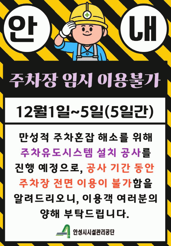 [NWS¹æ¼Û=Çѽ¸ñ ±âÀÚ]¾È¼º½Ã½Ã¼³°ü¸®°ø´ÜÀº 12¿ù 1ÀϺÎÅÍ 5ÀϱîÁö 5Àϰ£ ¼®Á¤µ¿ °ø¿µÁÖÂ÷Àå ÁÖÂ÷À¯µµ½Ã½ºÅÛ ¼³Ä¡ °ø»ç·Î ÇØ´ç ÁÖÂ÷Àå ÀÌ¿ëÀ» ÇѽÃÀûÀ¸·Î Áß´ÜÇÑ´Ù°í ¹àÇû´Ù. ÁÖÂ÷À¯µµ½Ã½ºÅÛÀ̶õ Â÷·® ¿îÀüÀÚ°¡ ºó ÁÖÂ÷ °ø°£À» ½±°í ºü¸£¡¦