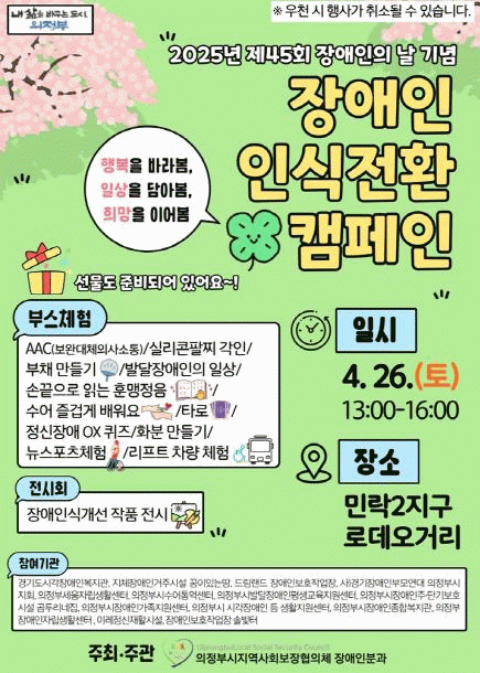 [NWS¹æ¼Û=Çѽ¸ñ ±âÀÚ]ÀÇÁ¤ºÎ½Ã´Â 4¿ù 19ÀÏ °³ÃÖ ¿¹Á¤À̾ú´ø ÀÇÁ¤ºÎ½Ã Áö¿ª»çȸº¸ÀåÇùÀÇü Àå¾ÖÀκаú ÁÖÃÖ ¡®Àå¾ÖÀÎ ÀνÄÀüȯ Ä·ÆäÀΡ¯À» ¿ìõ ¿¹º¸·Î ÀÎÇØ ÀÏÁÖÀÏ ¿¬±âÇÑ´Ù°í ¹àÇû´Ù. Çà»ç´Â 26ÀÏ ¹Î¶ô2Áö±¸ ·Îµ¥¿À°Å¸® ±¤Àå¿¡¼­ ¿­¸®¡¦