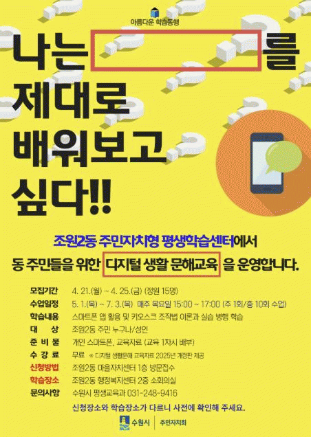 [»çȸ] ¼ö¿ø½Ã Àå¾È±¸ Á¶¿ø2µ¿, µðÁöÅÐ »ýȰ ¹®Çر³À° Âü¿©ÀÚ ¸ðÁý |2025. 04.18