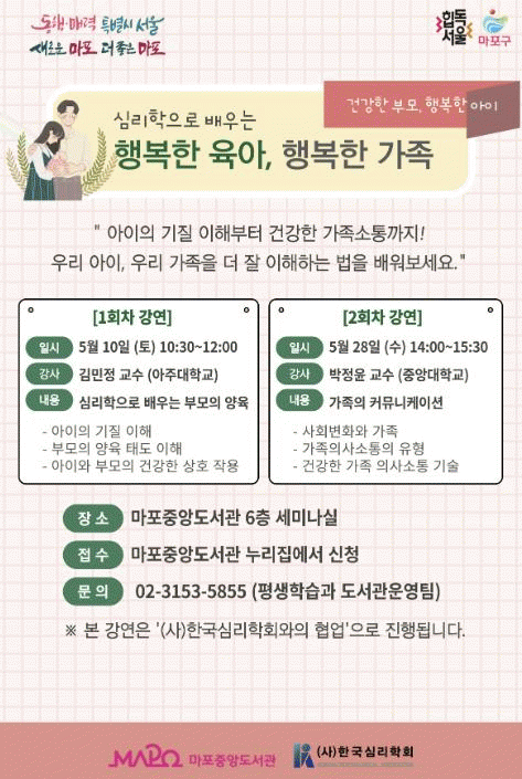 [NWS¹æ¼Û=Çѽ¸ñ ±âÀÚ]¸¶Æ÷±¸´Â 5¿ù °¡Á¤ÀÇ ´ÞÀ» ¸Â¾Æ ¸¶Æ÷Áß¾Óµµ¼­°ü ¼¼¹Ì³ª½Ç¿¡¼­ ¾çÀ°ÀÚ¸¦ À§ÇÑ Æ¯º° °­¿¬ ½Ã¸®Áî ¡®ºÎ¸ð¿Í ¾ÆÀ̰¡ ÇÔ²² ÀÚ¶ó´Â ½Ã°£¡¯À» ¿î¿µÇÑ´Ù. À̹ø °­¿¬Àº ¼­¿ïƯº°½Ã µ¶¼­¹®È­Á¤Ã¥ ºê·£µå ¡®Èüµ¶¼­¿ï¡¯ÀÇ ¸ñÇ¥¡¦