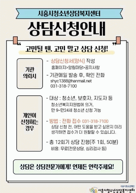 [NWS¹æ¼Û=Çѽ¸ñ ±âÀÚ]½ÃÈï½Ã´Â °ü³» û¼Ò³âÀÇ Àü¹® ½É¸®»ó´ãÀ» ÅëÇØ û¼Ò³âµéÀÇ Á¤½Å°Ç°­ ÁõÁøÀº ¹°·Ð, À§±â »óȲ¿¡ ¼±Á¦ ´ëÀÀ ÇϰíÀÚ ½ÃÈï½Ãû¼Ò³â»ó´ãº¹Áö¼¾Å͸¦ ¿î¿µÇϰí ÀÖ´Ù. ¼¾ÅÍ¿¡¼­´Â ¸¸ 9¼¼ºÎÅÍ 24¼¼ ÀÌÇÏ Ã»¼Ò³âÀ» ´ë»óÀ¸·Î ¡¦