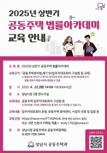 [NWS¹æ¼Û=Çѽ¸ñ ±âÀÚ]¼º³²½Ã´Â ¿À´Â 4¿ù 22ÀÏ ¿ÀÈÄ 2½ÃºÎÅÍ 6½Ã±îÁö ½Ãû 3Ãþ ÇÑ´©¸®½Ç¿¡¼­ ¡®2025³â »ó¹Ý±â °øµ¿ÁÖÅà ¹ý·ü¾ÆÄ«µ¥¹Ì ±³À°¡¯À» ½Ç½ÃÇÑ´Ù. À̹ø ±³À°Àº ÀÔÁֹεéÀÌ °øµ¿ÁÖÅà °ü·Ã ¹ý·ÉÀ» ¿Ã¹Ù¸£°Ô ÀÌÇØÇϰí, Åõ¸íÇÑ °øµ¿ÁÖ¡¦