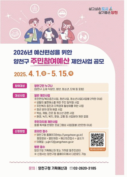 [NWS¹æ¼Û=Çѽ¸ñ ±âÀÚ]¾çõ±¸´Â ³»³âµµ »ç¾÷°ú ¿¹»ê Æí¼º¿¡ ±¸¹ÎÀÇ ¸ñ¼Ò¸®¸¦ ¹Ý¿µÇϱâ À§ÇØ ¡®2026³âµµ ÁÖ¹ÎÂü¿©¿¹»ê Á¦¾È»ç¾÷¡¯ °ø¸ð¸¦ ´ÙÀ½ ´Þ 15ÀϱîÁö ÁøÇàÇÑ´Ù°í 18ÀÏ ¹àÇû´Ù. ÁÖ¹ÎÂü¿©¿¹»êÁ¦´Â ¿¹»ê Æí¼º°úÁ¤¿¡¼­ ±¸¹ÎÀÌ Á÷Á¢ Áö¿ª¡¦