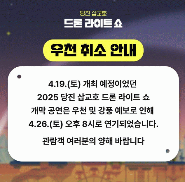 [»çȸ] ´çÁø½Ã, 19ÀÏ »ð±³È£ µå·Ð ¶óÀÌÆ® ¼î °³¸·½Ä ¿ìõÀ¸·Î ¿¬±âµÅ |2025. 04.18