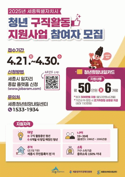 [°æÁ¦] ¼¼Á¾½Ã ±¸Á÷ û³â¿¡ ¿ù ÃÖ´ë 50¸¸ ¿ø Áö¿ø |2025. 04.18