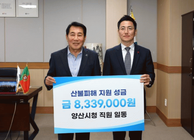 [NWS¹æ¼Û=Çѽ¸ñ ±âÀÚ]¾ç»ê½Ã´Â 17ÀÏ ¿ÀÈÄ ½ÃÀå Áý¹«½Ç¿¡¼­ »êºÒ ÇÇÇØ ÁֹεéÀ» µ½±â À§ÇÑ ¸ð±Ý¼º±Ý 8,339,000¿øÀ» °æ³²»çȸº¹Áö°øµ¿¸ð±Ýȸ¿¡ Àü´ÞÇß´Ù. À̹ø ¸ð±ÝÀº ¾ç»ê½ÃÀåÀ» ºñ·ÔÇÑ 1,300¿©¸íÀÇ ¾ç»ê½Ãû Á÷¿øÀÌ ÀÚ¹ßÀûÀ¸·Î µ¿ÂüÇØ¡¦