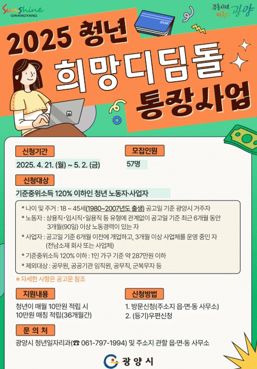 [NWS¹æ¼Û=Çѽ¸ñ ±âÀÚ]±¤¾ç½Ã°¡ û³âµéÀÇ ¹Ì·¡ Áغñ¿Í ¾ÈÁ¤Àû ÀÚ»êÇü¼ºÀ» À§ÇØ 2025³â ¡®Ã»³â Èñ¸Áµðµõµ¹ ÅëÀå»ç¾÷¡¯ÀÇ ´ë»óÀÚ¸¦ ¸ðÁýÇÑ´Ù. ¡®Ã»³â Èñ¸Áµðµõµ¹ ÅëÀå»ç¾÷¡¯Àº û³âÀÌ 36°³¿ù µ¿¾È ¸Å¿ù 10¸¸ ¿ø¾¿ Àû¸³Çϸé, ½Ã¿¡¼­ µ¿ÀÏ ±Ý¡¦