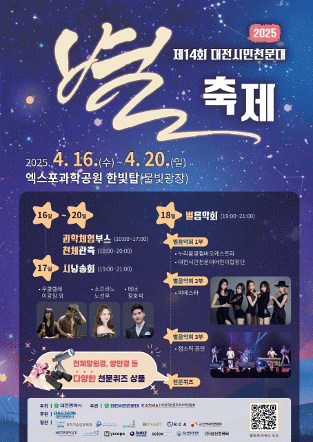 [NWS¹æ¼Û=Çѽ¸ñ ±âÀÚ]´ëÀü½Ã´Â ¿À´Â 4¿ù 18ÀÏ ¿ÀÈÄ 7½ÃºÎÅÍ 9½Ã±îÁö ¿¢½ºÆ÷°úÇаø¿ø Ư¼³¹«´ë¿¡¼­ ¡®Á¦14ȸ ´ëÀü½Ã¹Îõ¹®´ë º°ÃàÁ¦¡¯¸¦ °³ÃÖÇÑ´Ù. À̹ø ÃàÁ¦´Â °úÇбâ¼úÁ¤º¸Åë½ÅºÎ°¡ ÁÖ°üÇÏ´Â 2025 ´ëÇѹα¹ °úÇÐÃàÁ¦, °úÇбâ¼ú´ëÀüÀÌ ¡¦
