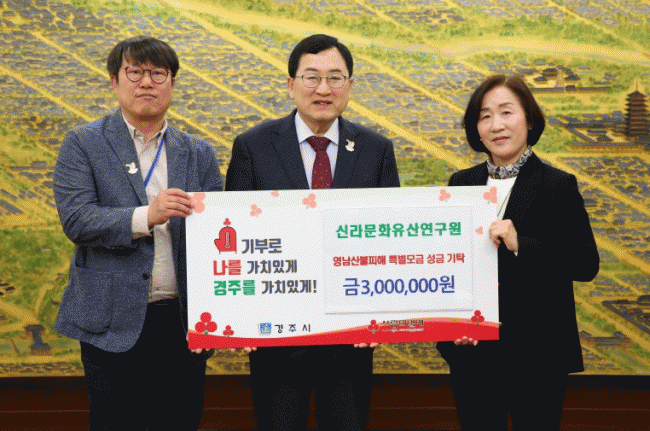 [NWS¹æ¼Û=Çѽ¸ñ ±âÀÚ]2025³â 4¿ù 16ÀÏ, ½Å¶ó¹®È­À¯»ê¿¬±¸¿øÀº °æÁÖ½ÃûÀ» ¹æ¹®ÇÏ¿© ¿µ³²Áö¿ª »êºÒ ÇÇÇØ ÀÌÀç¹ÎÀ» À§ÇØ ¼º±Ý 300¸¸¿øÀ» ±âŹÇß´Ù. ½Å¶ó¹®È­À¯»ê¿¬±¸¿øÀº °æÁÖ¸¦ ±â¹ÝÀ¸·Î ½Å¶ó½Ã´ë ¹®È­À¯»êÀÇ ¹ß±¼, ¿¬±¸, º¸Á¸ Ȱµ¿À» ÀÌ¡¦
