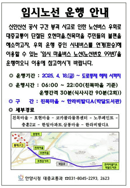 [NWS¹æ¼Û=Çѽ¸ñ ±âÀÚ]¾È¾ç½Ã´Â ½Å¾È»ê¼± °ø»çÇöÀå ºØ±« ÁöÁ¡ Àα٠µµ·Î°¡ Àü¸é ÅëÁ¦µÇ¸é¼­ ´ëÁß±³Åë ºÒÆíÀ» °Þ°í ÀÖ´Â ¹Ú´Þµ¿ Ä£¸ñ¡¤È£Çö¸¶À» ÁֹΠµîÀ» À§ÇØ ¿À´Â 18ÀϺÎÅÍ ¸¶À»¹ö½º 99¹ø(1´ë)À» ±ä±Þ ÅõÀÔÇØ Àӽà ¿îÇàÇÑ´Ù°í 17ÀÏ ¹àÇû¡¦