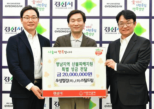 [NWS¹æ¼Û=Çѽ¸ñ ±âÀÚ]°æ»ê ¼ÒÀç ¿ì¼ºÃ¶°­(ÁÖ)°ú ¿µÃµ ¼ÒÀç (ÁÖ)½ºÆ¿µå¸²Àº 16ÀÏ °æ»ê½ÃûÀ» ÇÔ²² ¹æ¹®ÇÏ¿© ¿µ³²Áö¿ª »êºÒÇÇÇØ Áö¿ø ¼º±Ý 2,000¸¸¿øÀ» ±âŹÇß´Ù. Áö³­¡®Èñ¸Á2025³ª´®Ä·ÆäÀΡ¯¿¡¼­ ÀÌ¿ôµ½±â¼º±Ý 2,000¸¸¿ø ±âŹ¿¡ À̾î, ÀÌ¡¦