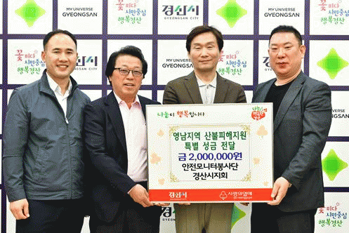 [NWS¹æ¼Û=Çѽ¸ñ ±âÀÚ]¾ÈÀü¸ð´ÏÅͺÀ»ç´Ü °æ»ê½ÃÁöȸ¿¡¼­ 16ÀÏ °æ»ê½ÃûÀ» ¹æ¹®ÇÏ¿© »êºÒ·Î Å« ÇÇÇØ¸¦ ÀÔÀº ÁֹεéÀ» µ½±â À§ÇØ ¼º±Ý 200¸¸¿øÀ» ±âŹ Çß´Ù. ÀÌÀÓÈ£ ȸÀåÀº ¡°»êºÒ ÇÇÇØ·Î »îÀÇ ÅÍÀüÀ» ÀÒÀº ÀÌÀç¹ÎµéÀÌ ÇÏ·ç »¡¸® ÀÏ»óÀ¸·Î¡¦