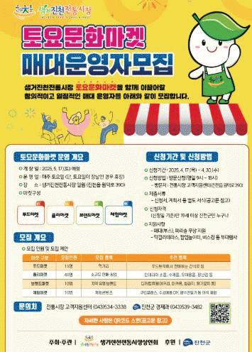 [NWS¹æ¼Û=Çѽ¸ñ ±âÀÚ] ÃæºÏ ÁøÃµ±º°ú »ý°ÅÁøÃµÀüÅë½ÃÀå»óÀÎȸ´Â ¡®»ý°ÅÁøÃµÀüÅë½ÃÀå Åä¿ä¹®È­¸¶ÄÏ¡¯¿¡ Âü¿©ÇÒ ¸Å´ë ¿î¿µÀÚ(¼¿·¯)¸¦ °ø°³ ¸ðÁýÇÑ´Ù°í 17ÀÏ ¹àÇû´Ù. Åä¿ä¹®È­¸¶ÄÏÀº ÀüÅë½ÃÀåÀÇ È°¼ºÈ­¿Í Áö¿ªÁÖ¹ÎÀÇ ¹®È­ ÇâÀ¯ ±âȸ È®¡¦
