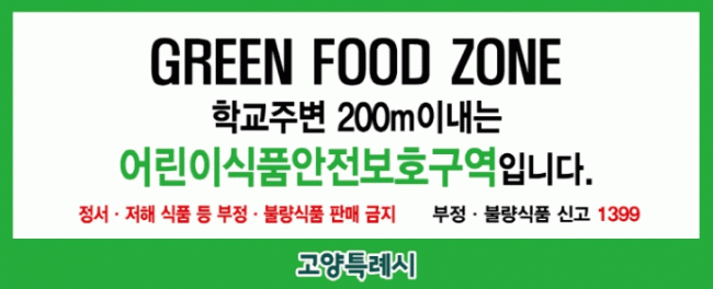 [NWS¹æ¼Û=Çѽ¸ñ ±âÀÚ]°í¾çƯ·Ê½Ã´Â °ü³» Çб³ ÁÖº¯ÀÇ ¾ÈÀüÇÑ ½Äǰ ÆÇ¸Å ȯ°æ Á¶¼ºÀ» À§ÇØ ¡®¾î¸°ÀÌ ½Äǰ¾ÈÀüº¸È£±¸¿ª(Green Food Zone)¡¯ÁöÁ¤ Ç¥ÁöÆÇ ÀÏÁ¦ Á¤ºñ¸¦ ÃßÁøÇÑ´Ù°í 4ÀÏ ¹àÇû´Ù. ¡®¾î¸°ÀÌ ½Äǰ¾ÈÀüº¸È£±¸¿ª¡¯Àº Çб³¿Í ÇØ´ç ÇС¦