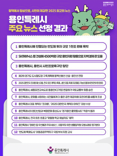 [NWS¹æ¼Û=Çѽ¸ñ ±âÀÚ]2025³â ¿ëÀÎÆ¯·Ê½Ã¸¦ ºû³½ ÃÖ°íÀÇ ´º½º·Î '¹ÝµµÃ¼ ÅõÀÚ±Ô¸ð 1000Á¶ ¿ø¿¡ À°¹Ú'ÀÌ »ÌÇû´Ù. 'SKÇÏÀ̴нº ÆÕ °Ç¼³¿¡ 4500¾ï ¿ø ±Ô¸ð ¿ëÀÎ Áö¿ªÀÚ¿ø Ȱ¿ë¡¯°ú '¿ëÀνà ½Ã¹ÎÇÁ·ÎÃ౸´Ü â´Ü'ÀÌ °¢°¢ 2À§, 3À§¸¦ Â÷ÁöÇß´Ù¡¦