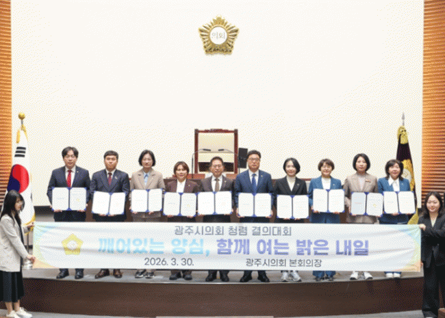 [NWS¹æ¼Û=Çѽ¸ñ ±âÀÚ]±¤ÁÖ½ÃÀÇȸ´Â 3¿ù 30ÀÏ Á¦323ȸ ÀÓ½Ãȸ Á¦2Â÷ º»È¸ÀÇ Á¾·á ÈÄ º»È¸ÀÇÀå¿¡¼­ ¡®Ã»·Å °áÀÇ´ëȸ¡¯¸¦ °³ÃÖÇß´Ù°í ¹àÇû´Ù. À̹ø °áÀÇ´ëȸ´Â Á¦9´ë ±¤ÁÖ½ÃÀÇȸÀÇ ¸¶Áö¸· ȸ±â¸¦ ¸Â¾Æ ±×°£ÀÇ ÀÇÁ¤È°µ¿À» µÇµ¹¾Æº¸°í, °ø¡¦