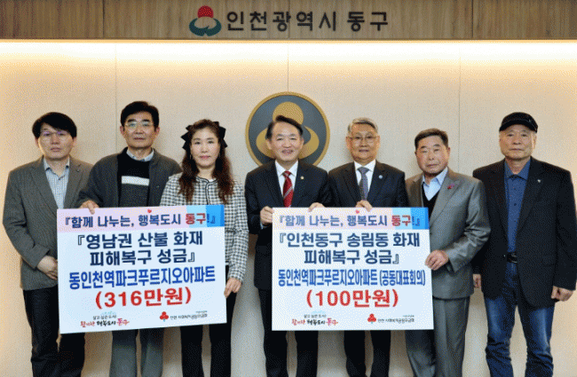 [NWS¹æ¼Û=Çѽ¸ñ ±âÀÚ]ÀÎõ µ¿±¸´Â Áö³­ 15Àϵ¿ÀÎõ¿ªÆÄũǪ¸£Áö¿À(ÀÔÁÖÀÚ ´ëǥȸ °øµ¿È¸Àå Àü¼º¼ö¡¤À̼®¹Ì)°¡ ¿µ³²±Ç »êºÒ ¹× ¼Û¸²µ¿ È­Àç ÇÇÇØ º¹±¸¸¦ À§ÇÑ ¼º±Ý 416¸¸¿øÀ» ±âŹÇß´Ù°í ¹àÇû´Ù. Àü¼º¼ö ÀÔÁÖÀÚ´ëÇ¥ ȸÀåÀº ¡°À̹ø È­Àç·Î¡¦