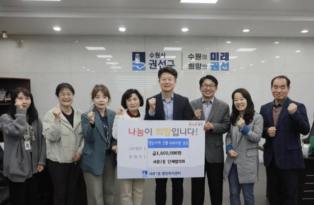 [NWS¹æ¼Û=Çѽ¸ñ ±âÀÚ]¼ö¿ø½Ã ±Ç¼±±¸ ¼¼·ù1µ¿ ´ÜüÇùÀÇȸ´Â Áö³­ 16ÀÏ, ¿µ³²Áö¿ª »êºÒÇÇÇØ ÁÖ¹ÎÀ» µ½±â À§ÇØ ¼º±Ý 160¸¸¿ø¸¦ Àü´ÞÇß´Ù. À̹ø ¼º±ÝÀº »êºÒ ÇÇÇØ Áö¿ªÀÎ ¿µ³² Áö¿ªÀÇ ºü¸¥ º¹±¸¿Í ÀÌÀç¹Î Áö¿øÀ» À§ÇØ ¼¼·ù1µ¿ ´ÜüÀå ¹× À§¡¦
