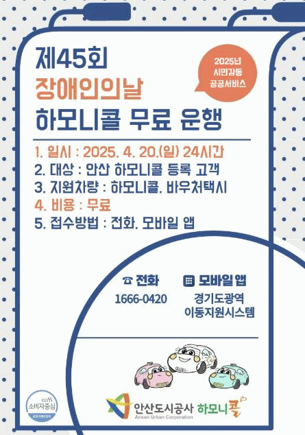 [NWS¹æ¼Û=Çѽ¸ñ ±âÀÚ]¾È»êµµ½Ã°ø»ç´Â ¿À´Â 4¿ù 20ÀÏ ¡®Á¦45ȸ Àå¾ÖÀÎÀÇ ³¯¡¯À» ¸Â¾Æ, ±³Åë¾àÀÚ¸¦ À§ÇÑ Æ¯º°±³Åë¼ö´ÜÀÎ Çϸð´ÏÄݰú ¹Ù¿ìóÅýø¦ ÇÏ·ç µ¿¾È ¹«·á ¿îÇàÇÑ´Ù°í 17ÀÏ ¹àÇû´Ù. Çϸð´ÏÄݰú ¹Ù¿ìóÅýô ¡ã´ëÁß±³Åë ÀÌ¿ëÀÌ ¾î¡¦
