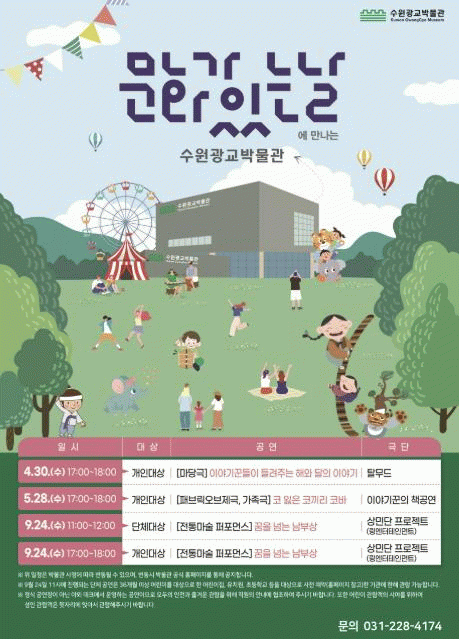 [NWS¹æ¼Û=Çѽ¸ñ ±âÀÚ]¼ö¿ø±¤±³¹Ú¹°°üÀÌ 4¡¤5¡¤9¿ù ¡®¹®È­°¡ ÀÖ´Â ³¯¡¤°æ±âµµ ¹®È­ÀÇ ³¯¡¯(¸Å´Þ ¸¶Áö¸· ¼ö¿äÀÏ)¿¡ ¹Ú¹°°ü ¾ß¿Ü °ø°£¿¡¼­ ¾î¸°À̵éÀ» À§ÇÑ ¹«·á °ø¿¬À» ¼±º¸ÀδÙ. 4¿ù 30ÀÏ ¿ÀÈÄ 5½Ã ¡®À̾߱â²ÛÀÌ µé·ÁÁÖ´Â ÇØ¿Í ´Þ À̾߱⡦