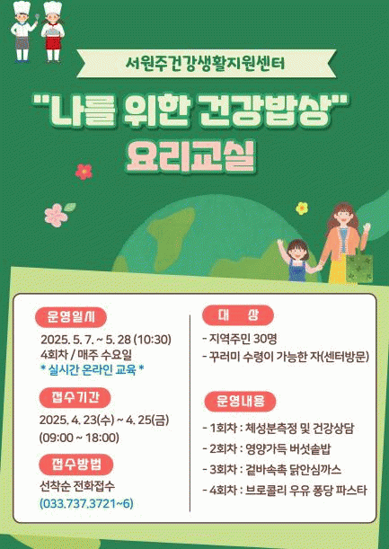 [»çȸ] ¼­¿øÁְǰ­»ýȰÁö¿ø¼¾ÅÍ, '³ª¸¦ À§ÇÑ °Ç°­¹ä»ó' ¿ä¸®±³½Ç Âü¿©ÀÚ ¸ðÁý |2025. 04.17