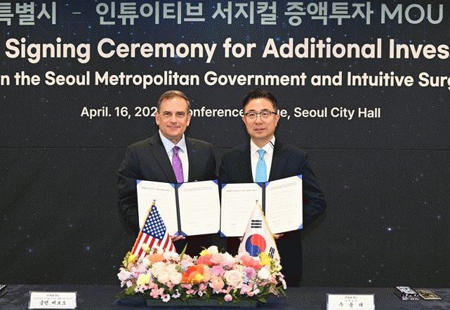 [NWS¹æ¼Û=ÇãÀº¼­ ±âÀÚ]¼­¿ï½Ã°¡ ·Îº¿¼ö¼ú ºÐ¾ß ¼¼°è 1À§ ±â¾÷ÀÎ ¡®ÀÎÆ©ÀÌÆ¼ºê ¼­ÁöÄÃ(Intuitive Surgical)¡¯·ÎºÎÅÍ 150¾ï ¿ø(FDI: ¿Ü±¹ÀÎÁ÷Á¢ÅõÀÚ)ÀÇ ÅõÀÚÀ¯Ä¡¿¡ ¼º°øÇß´Ù. ¼­¿ï½Ã´Â 4¿ù 16ÀÏ ¿ÀÀü, ½Ãû º»°ü °£´ãȸÀå¿¡¼­ Ú¸ ¼ö¼ú ·Î¡¦