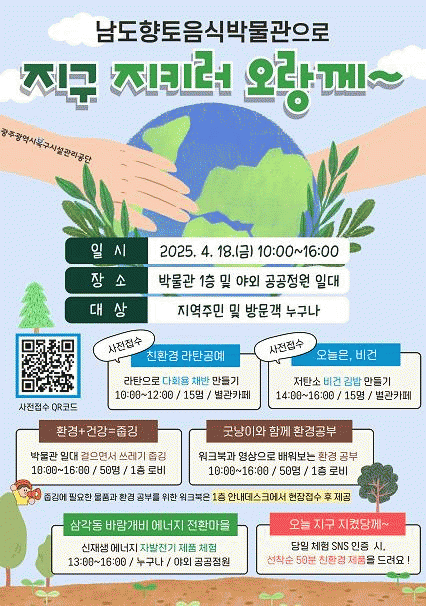 [NWS¹æ¼Û=Çѽ¸ñ ±âÀÚ]±¤Áֺϱ¸½Ã¼³°ü¸®°ø´ÜÀº Á¦55ÁÖ³â Áö±¸ÀÇ ³¯À» ±â³äÇÏ¿© ¿À´Â 18ÀÏ, 10:00ºÎÅÍ 16:00±îÁö ³²µµÇâÅäÀ½½Ä¹Ú¹°°ü 1Ãþ ¹× ¾ß¿Ü °ø°øÁ¤¿ø¿¡¼­ ¡®Áö±¸ ÁöŰ·¯ ¿À¶û²²~¡¯ Çà»ç¸¦ °³ÃÖÇÑ´Ù°í ¹àÇû´Ù. Áö±¸ÀÇ ³¯Àº ȯ°æ ¿À¡¦