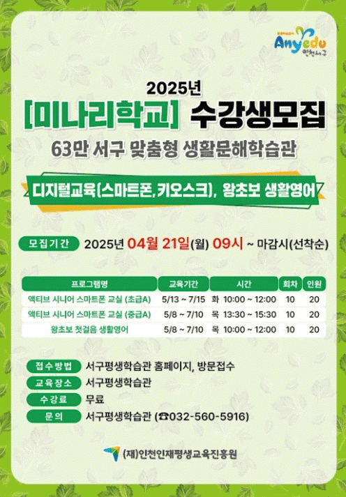 [»çȸ] ÀÎõ ¼­±¸, »ýȰ¹®ÇØÇнÀ°ü ¡®¹Ì³ª¸® Çб³¡¯ ¼ö°­»ý ¸ðÁý |2025. 04.16