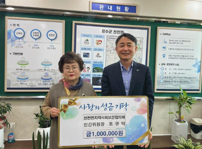 [NWS¹æ¼Û=Çѽ¸ñ ±âÀÚ] Àå¼ö±º õõ¸éÀº Áö³­ 15ÀÏ ÃµÃµ¸é Áö¿ª»çȸº¸ÀåÇùÀÇü Á¶±Ô´ö ¹Î°£À§¿øÀåÀÌ ¾î·Á¿î ÀÌ¿ô°ú Ãë¾à°èÃþ ¾Æµ¿ Áö¿øÀ» À§ÇØ 100¸¸¿øÀ» ±âŹÇß´Ù°í ¹àÇû´Ù. ±âºÎµÈ ¼º±ÝÀº õõ¸é ³» ¼Ò¿ÜµÈ ÀÌ¿ôÀ» Áö¿øÇϴ õõ¸é Áö¡¦