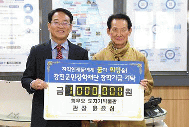 [NWS¹æ¼Û=Çѽ¸ñ ±âÀÚ]¾î·Á¿î ½Ã±â¿¡µµ °­Áø±º¹ÎÀåÇÐÀç´ÜÀ» ÇâÇÑ ÀåÇÐ±Ý ±âŹ Çà·ÄÀÌ À̾îÁö°í ÀÖ´Â °¡¿îµ¥ Áö³­ 14ÀÏ À±À¯¼· û¿ì¿ä µµÀÚ±â¹Ú¹°°ü °üÀå 1¹é¸¸ ¿ø, À±Á¤ÀÎ °­Áø ½ÒÆÇ¸ÅÂü¿©¾÷üÇùÀÇȸ ȸÀåÀÌ 2¹é¸¸ ¿øÀ» °­Áø±º¹ÎÀåÇÐÀç´Ü¡¦