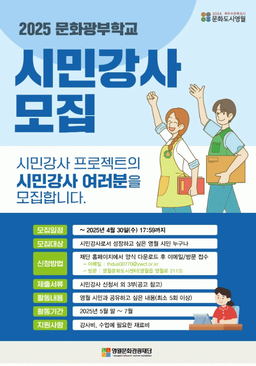 [NWS¹æ¼Û=Çѽ¸ñ ±âÀÚ](Àç)¿µ¿ù¹®È­°ü±¤Àç´ÜÀº ¹ýÁ¤ ¹®È­µµ½Ã Á¶¼º»ç¾÷ÀÇ ÀÏȯÀ¸·Î ÃßÁøµÇ´Â ¡®2025 »ó¹Ý±â ½Ã¹Î°­»ç ÇÁ·ÎÁ§Æ®¡¯ÀÇ Âü¿©ÀÚ¸¦ ¿À´Â 4¿ù 30ÀϱîÁö ¸ðÁýÇÑ´Ù°í ¹àÇû´Ù. À̹ø ÇÁ·ÎÁ§Æ®´Â ¿µ¿ù±º¹ÎÀÌ Á÷Á¢ °­»ç·Î Âü¿©Çϰí ÇÁ¡¦