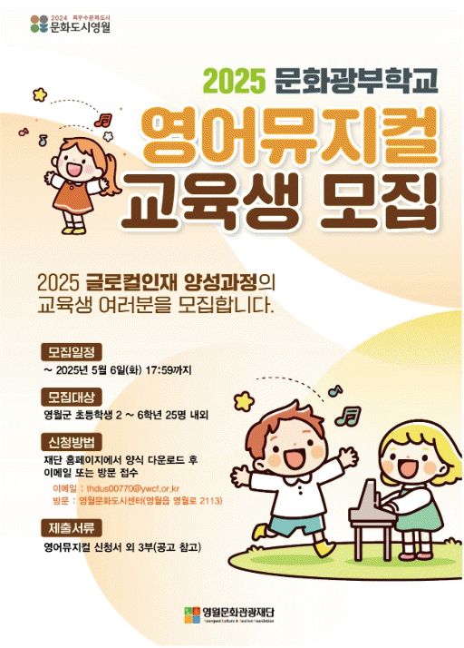 [NWS¹æ¼Û=Çѽ¸ñ ±âÀÚ](Àç)¿µ¿ù¹®È­°ü±¤Àç´ÜÀº Áö¿ª ¾Æµ¿À» À§ÇÑ ¡®¾î¸°ÀÌ ¿µ¾î ¹ÂÁöÄà ¼ö¾÷¡¯ ±³À°»ýÀ» ¿À´Â 5¿ù 6ÀϱîÁö ¸ðÁýÇÑ´Ù°í ¹àÇû´Ù. À̹ø ÇÁ·Î±×·¥Àº ¿µ¿ù±º ÃʵîÇб³ 2~6ÇгâÀ» ´ë»óÀ¸·Î ÃÑ 25¸íÀ» ¼±¹ßÇϸç, ¼±Âø¼øÀ¸·Î Á¢¡¦