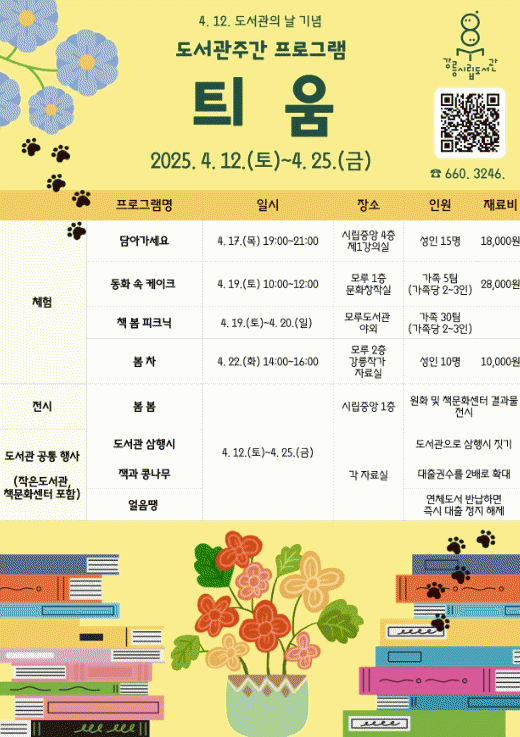 [NWS¹æ¼Û=Çѽ¸ñ ±âÀÚ]°­¸ª½Ã¸³µµ¼­°üÀº 4¿ù 12ÀÏ µµ¼­°üÀÇ ³¯À» ±â³äÇÏ¿© ´Ùä·Î¿î ÇÁ·Î±×·¥À» ÁøÇàÇÑ´Ù. »ó½Ã ÇÁ·Î±×·¥À¸·Î´Â ¿À´Â 4¿ù 25ÀϱîÁö ¿î¿µµÇ´Â ¡ãº½ º½(¿øÈ­ ¹× Ã¥¹®È­¼¾ÅÍ °á°ú¹° Àü½Ã) ¡ãµµ¼­°ü »ïÇà½Ã ¡ãÀè°ú Äᳪ¹«(´ë¡¦
