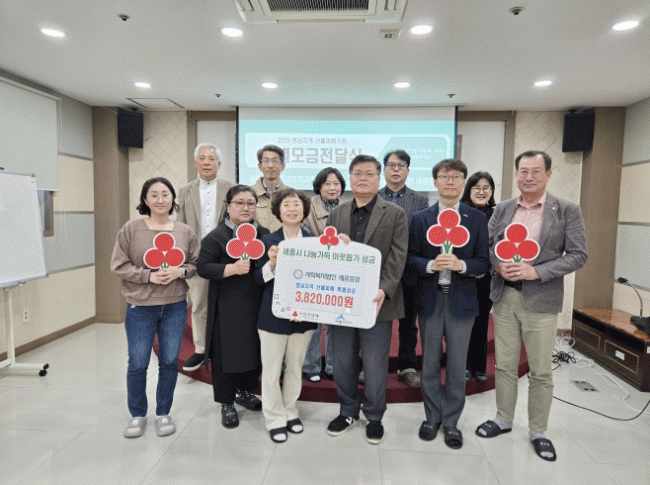 [NWS¹æ¼Û=Çѽ¸ñ ±âÀÚ]¼¼Á¾Æ¯º°ÀÚÄ¡½Ã ¿¬¼­¸é Áö¿ª»çȸº¸ÀåÇùÀÇü(°øµ¿À§¿øÀå ±èÇп롤ÇÑÀçÇö)¿Í ¼¼Á¾»çȸº¹Áö°øµ¿¸ð±Ýȸ°¡ 15ÀÏ Á¤µ¿Ã¼Ç踶À»(´ëÇ¥ÀÌ»ç Á¤µ¿¼ö)¿¡ ÂøÇѰ¡°Ô ÇöÆÇÀ» Àü´ÞÇß´Ù. ¿¬¼­¸é ±â·æ¸®¿¡ À§Ä¡ÇÑ Á¤µ¿Ã¼Ç踶À»Àº ÀÌ¡¦