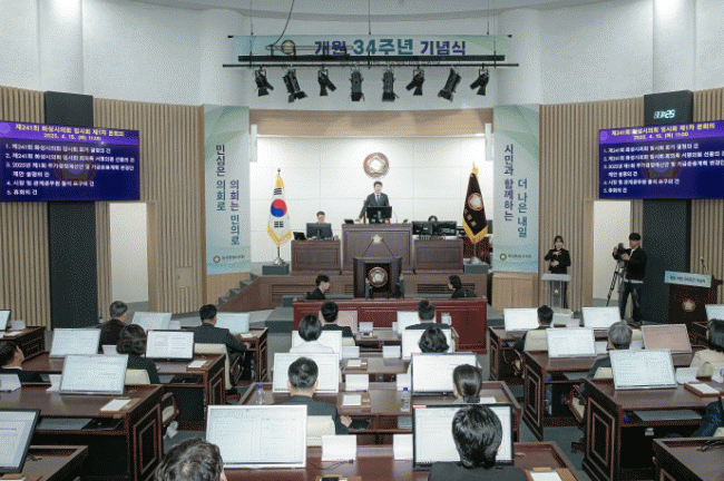 [NWS¹æ¼Û=Çѽ¸ñ ±âÀÚ]È­¼ºÆ¯·Ê½ÃÀÇȸ´Â 15ÀÏ ¿ÀÀü 10½Ã 30ºÐ, ½ÃÀÇȸ º»È¸ÀÇÀå¿¡¼­ °³¿ø 34Áֳ⠱â³ä½ÄÀ» °³ÃÖÇϰí, Áö³­ ÀÇÁ¤ Ȱµ¿ÀÇ ¼º°ú¸¦ µ¹¾Æº¸¸ç ¹Ì·¡¸¦ ÇâÇÑ »õ·Î¿î µµ¾àÀÇ ÀÇÁö¸¦ ´ÙÁ³´Ù. À̳¯ ±â³ä½ÄÀº °³¿ø 34ÁÖ³âÀ» ±â³äÇÏ¡¦