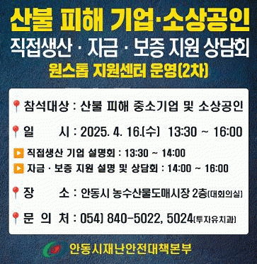 [»çȸ] ¾Èµ¿½Ã, »êºÒÇÇÇØ ±â¾÷ À§ÇÑ ¡®¿ø½ºÅé Áö¿ø¼¾ÅÍ(2Â÷)¡¯¼³¸íȸ °³ÃÖ |2025. 04.15