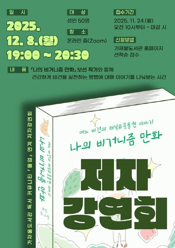 [NWS¹æ¼Û=Çѽ¸ñ ±âÀÚ]ÀÇÁ¤ºÎ°¡Àç¿ïµµ¼­°üÀº 12¿ù 8ÀÏ ¿ÀÈÄ 7½ÃºÎÅÍ '³ªÀÇ ºñ°Å´ÏÁò ¸¸È­'ÀÇ ÀúÀÚ º¸¼± ÀÛ°¡¸¦ ÃÊÃ»ÇØ ºñ´ë¸é ÀúÀÚ°­¿¬È¸¸¦ °³ÃÖÇÑ´Ù. À̹ø °­¿¬Àº ºñ´ë¸é µ¶¼­ ¸ðÀÓ ¡®¸ôÀÔ¡¯ÀÇ ¿¬°è ÇÁ·Î±×·¥À¸·Î, º¸¼± ÀÛ°¡¿Í Âü¿©ÀÚ°¡¡¦