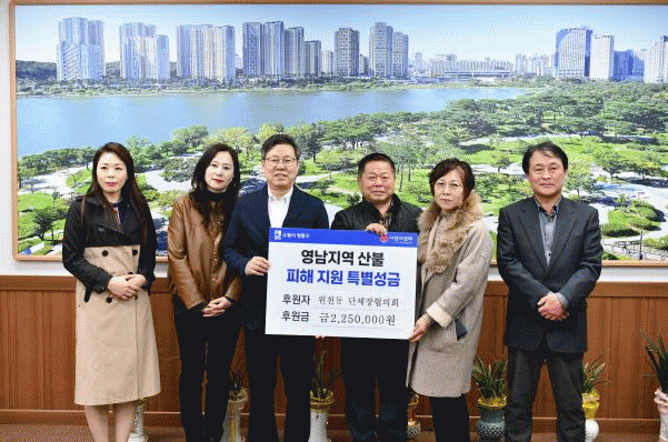 [NWS¹æ¼Û=Çѽ¸ñ ±âÀÚ]¼ö¿ø½Ã ¿µÅ뱸 ¸Åź1µ¿ »ç¶ûÀåÇÐÈÄ¿øÈ¸´Â Áö³­ 14ÀÏ, ÃÖ±Ù ¹ß»ýÇÑ ´ë±Ô¸ð »êºÒÀç³­ ÇÇÇØ Áö¿ª Áö¿øÀ» À§ÇÑ ¼º±Ý Àü´Þ½ÄÀ» °¡Á³´Ù. À̹ø Àü´Þ½Ä¿¡¼­´Â ¸Åź1µ¿ »ç¶ûÀåÇÐÈÄ¿øÈ¸¿¡¼­ µû¶æÇÑ ¸¶À½À» ¸ð¾Æ »êºÒ·Î ¾î·Á¿ò¡¦