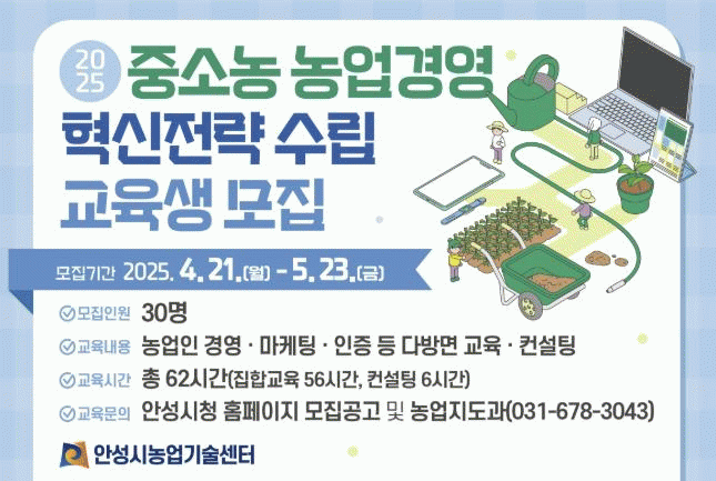 [NWS¹æ¼Û=Çѽ¸ñ ±âÀÚ]¾È¼º½Ã³ó¾÷±â¼ú¼¾ÅÍ´Â ¿À´Â 4¿ù 21ÀϺÎÅÍ 5¿ù 23ÀϱîÁö ¡®2025³â Áß¼Ò³ó ³ó¾÷°æ¿µ Çõ½ÅÀü·« ±³À°¡¯ ±³À°»ýÀ» ¸ðÁýÇÑ´Ù°í ¹àÇû´Ù. 2025³â Áß¼Ò³ó ³ó¾÷°æ¿µ Çõ½ÅÀü·« ±³À°Àº Àü¾÷³ó ±âÁØ ÀÌÇÏÀÇ Áß¼Ò±Ô¸ð ³ó¾÷ÀÎÀÇ ¾È¡¦