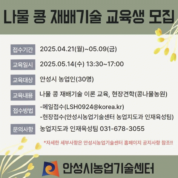 [»çȸ] ¾È¼º½Ã³ó¾÷±â¼ú¼¾ÅÍ, ½Å¼Òµæ ÀÛ¸ñ(³ª¹°Äá) Àç¹è±â¼ú ±³À°»ý ¸ðÁý |2025. 04.15