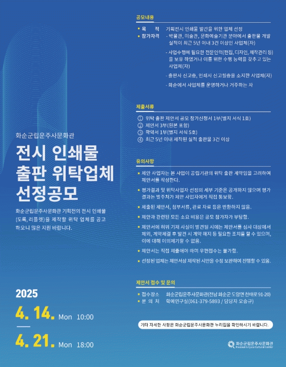 [»çȸ] È­¼ø±º¸³¿îÁֻ繮ȭ°ü, ±âȹÀü½Ã Àμ⹰ ÃâÆÇ À§Å¹¾÷ü ¼±Á¤ °ø¸ð |2025. 04.15