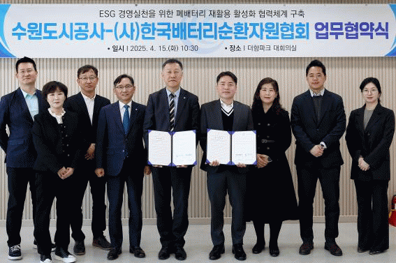[»çȸ] ESG °æ¿µÀ» ¼±µµÇÏ´Â ¼ö¿øµµ½Ã°ø»ç, Æó¹èÅ͸® ÀçȰ¿ë µî À§ÇØ (»ç)Çѱ¹¹èÅ͸®¼øÈ¯ÀÚ¿øÇùȸ¿Í ¾÷¹«Çù¾à |2025. 04.15